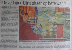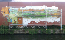 Historisch besef vegroten door middel van kunstwerken langs de limes-route. Muur grenst aan oude rijn en een dakpannenfabriek.